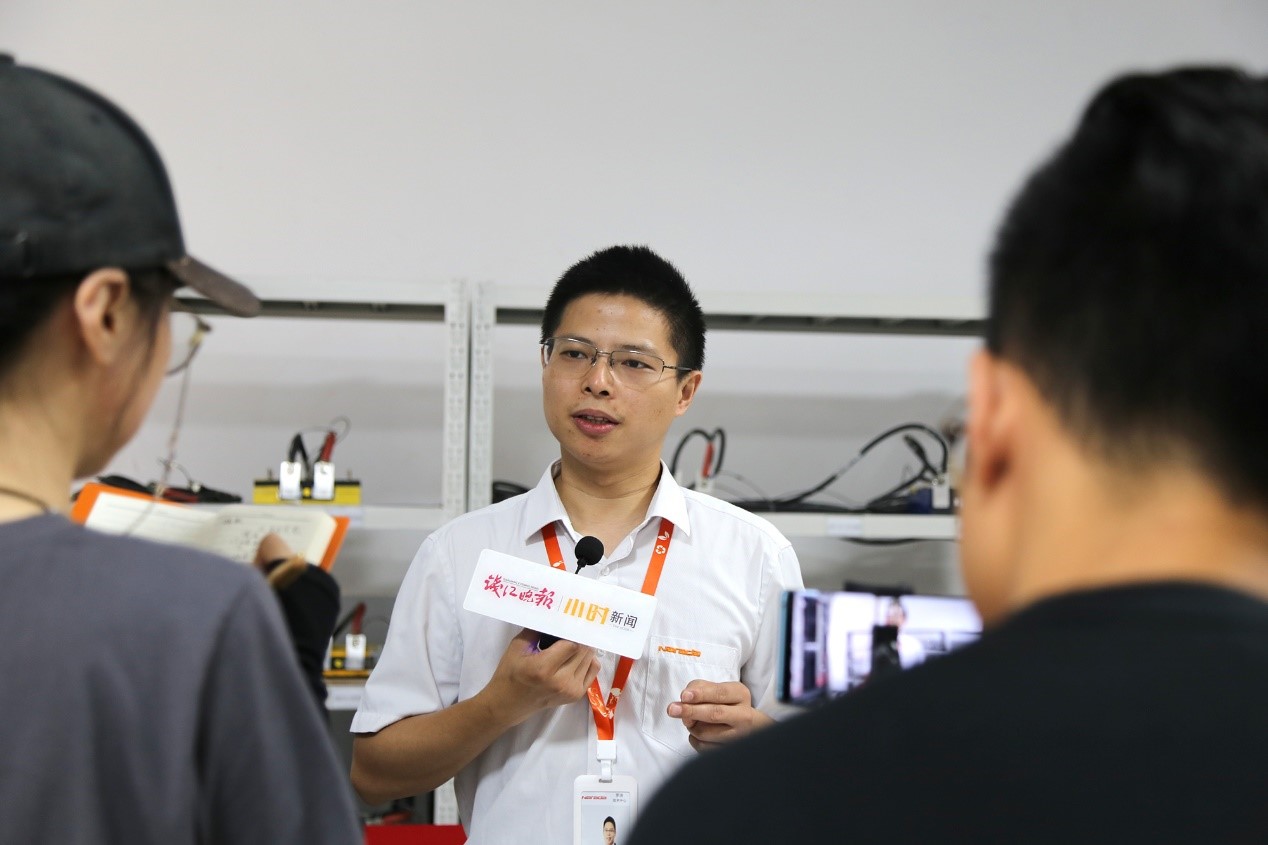 在电动自行车换电柜展示区,黄色仓库 民用锂电技术研发总监于文志向网友们介绍了换电柜的有关情况。