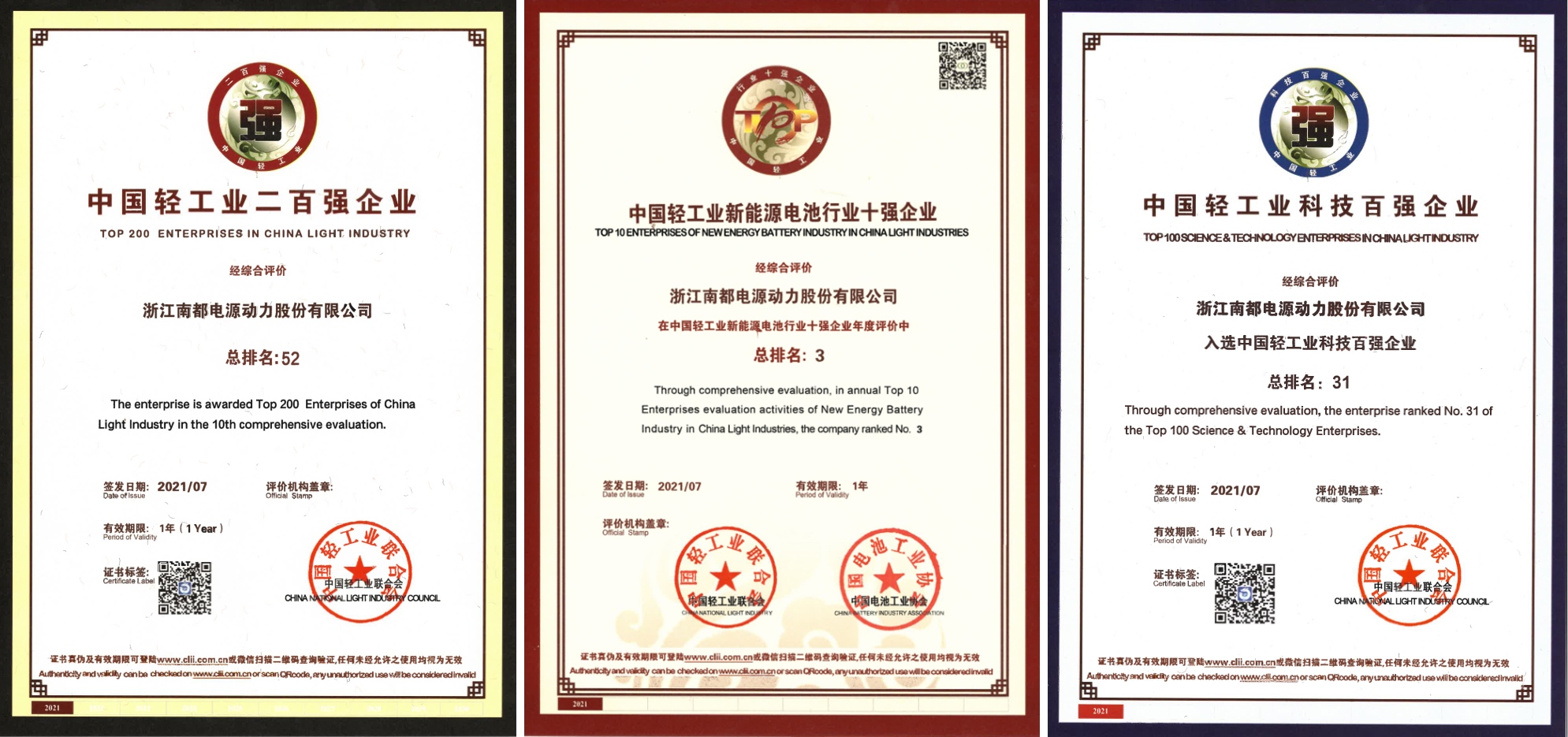 日前,中国轻工业联合会发布了 2020 年度中国轻工业二百强企业榜单,黄色仓库 再次入选,位列第 52 位,同时公司还荣获了中国轻工业科技百强榜第 31 位和中国轻工业新能源电池行业十强榜第 3 位。这也是“中国轻工业百强企业”自 2011 年发布以来,黄色仓库 连续十年上榜。