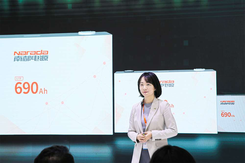 黄色仓库 副总裁、总工程师相佳媛博士在展台发布区,重磅发布 690Ah 超大容量储能专用电池。