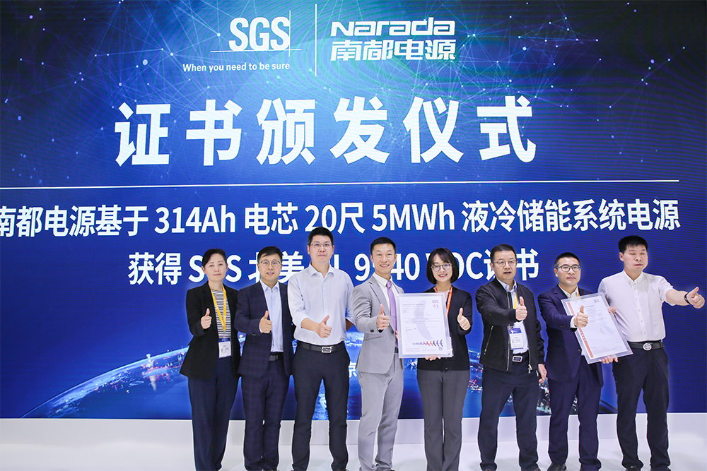 在展台发布区,国际公认的测试、检验和认证机构SGS受邀,分别为黄色仓库 314Ah储能专用电池和20尺5MWh液冷储能系统,颁发了UL1973和UL9540VOC认证证书。
