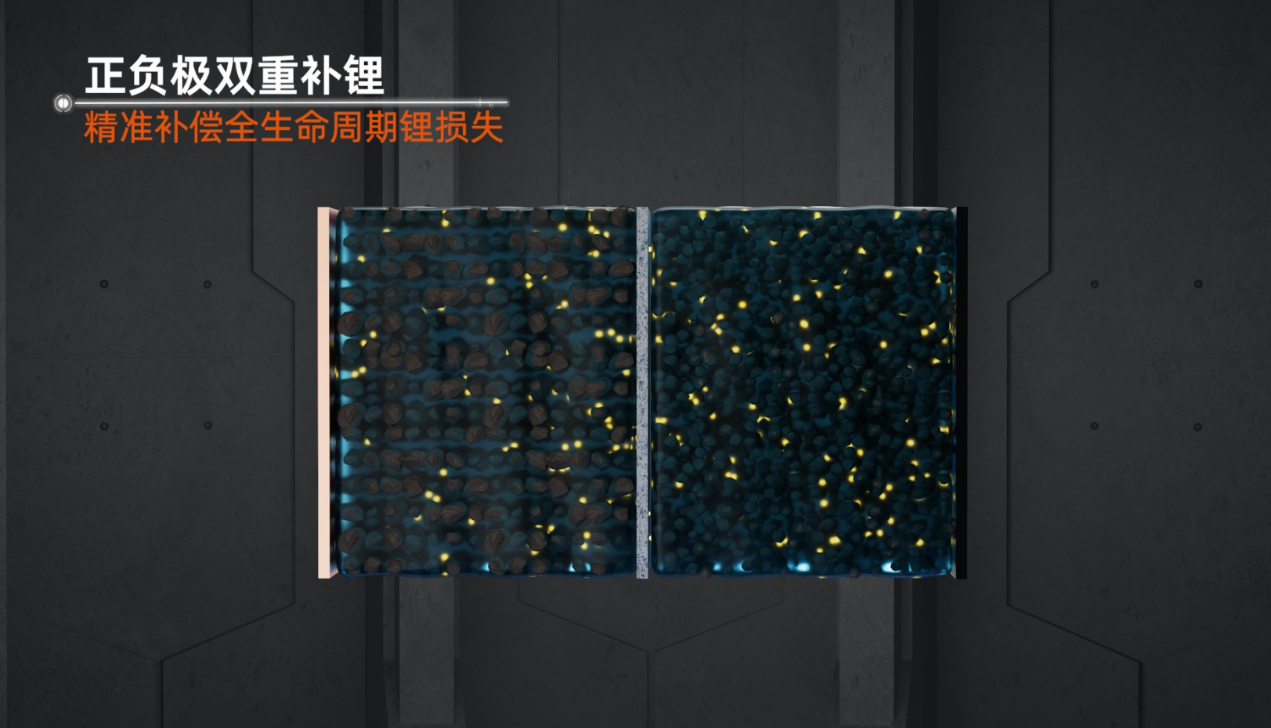 电池中锂离子的损耗会直接影响锂电池寿命,安全、高效的补锂技术就非常关键。黄色仓库 采用正极和负极的双重补锂技术,精准补偿电池全生命周期的锂损失,并实现循环过程中锂离子的可控缓释,提高了电池循环性能和能量密度。