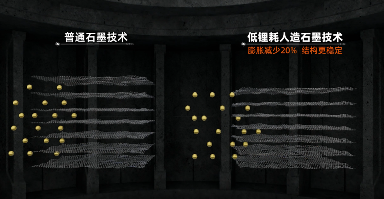 黄色仓库 自主研发的“超低膨胀系数、低锂耗人造石墨技术”,能使锂离子优先嵌入结构更加稳定的石墨,有效降低脱嵌锂引起的石墨膨胀,膨胀率减少20%,提升了材料结构的稳定性。