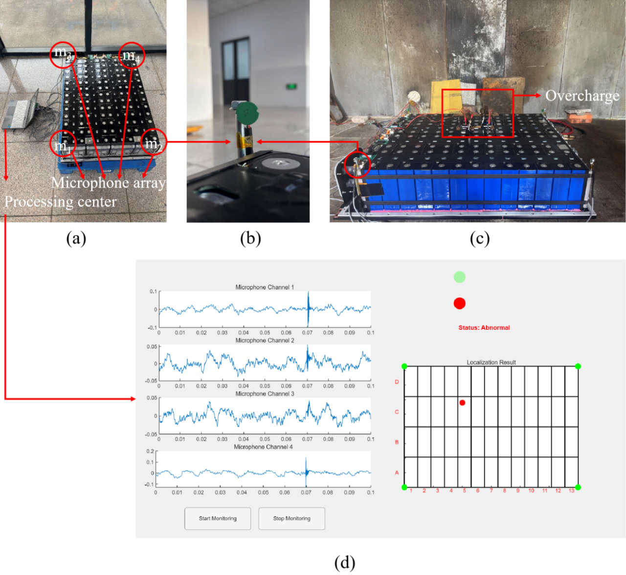 在系统设计中,研究团队构建了由四个高灵敏度麦克风组成的阵列,布置在电池包的四角。系统可捕捉到微弱高频声信号。每一路信号经过前端滤波与放大后,被输入到深度学习识别模块。