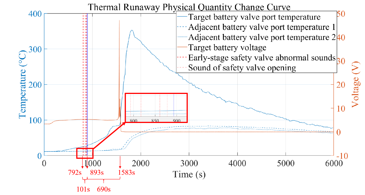 实验结果表明,声学预警系统在安全阀开启前101秒即可识别到早期异常信号,在热失控爆发前791 s发出可靠预警,检测准确率超过90%,显著领先于传统传感预测手段。